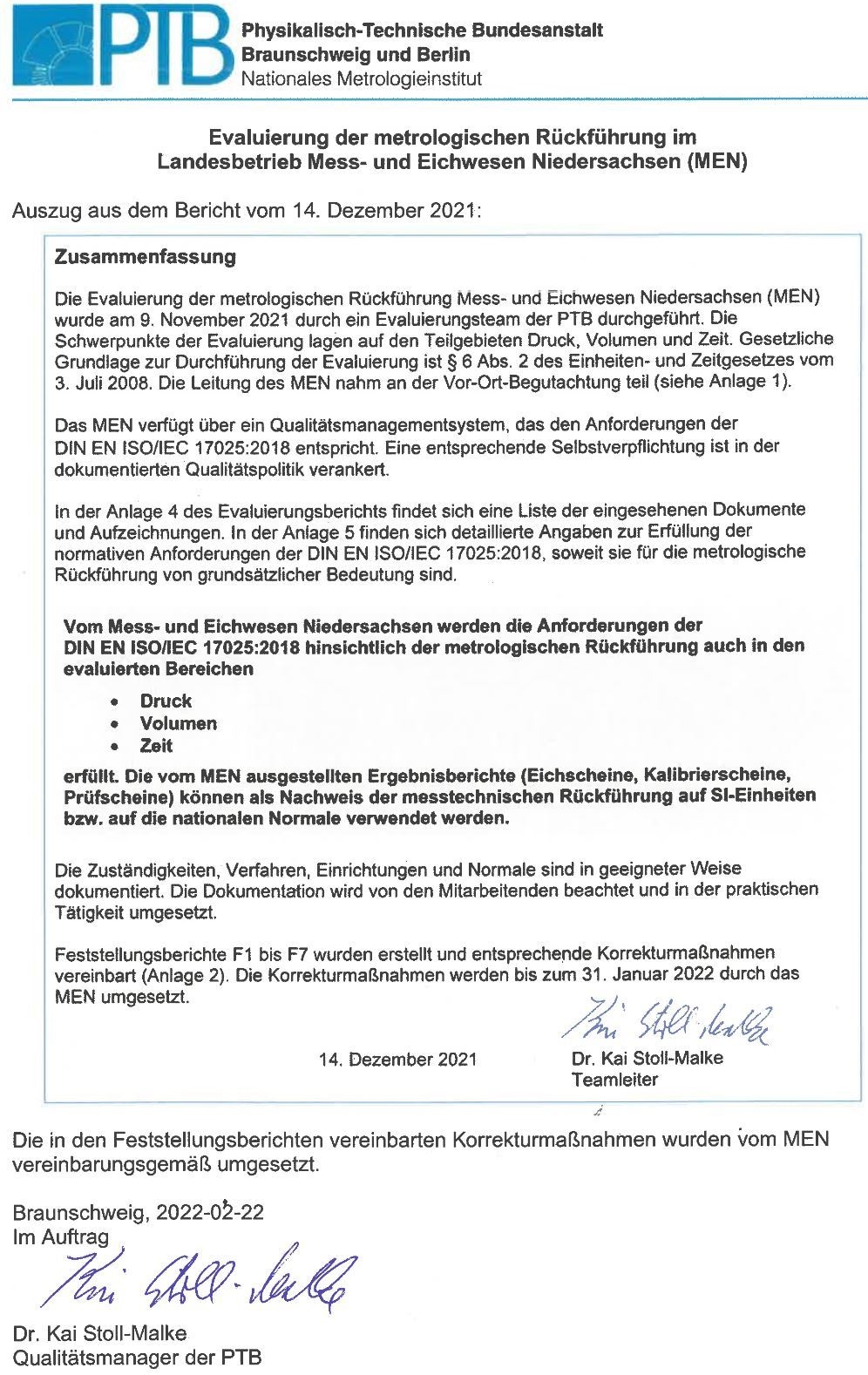 Das Mess- und Eichwesen Niedersachsen (MEN) wird regelmäßig von der Physikalisch-Technischen Bundesanstalt (PTB) hinsichtlich der Erfüllung der DIN EN ISO/IEC 17025 zur messtechnischen Rückführung nach § 6 EinhZeitG evaluiert.