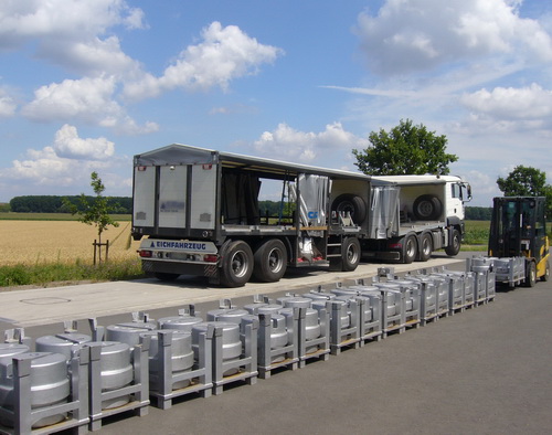 Eichung einer Fahrzeugwaage: Belastung bei der messtechnischen Prüfung mit einem Lkw und Gewichten bekannter Größe (Normale).