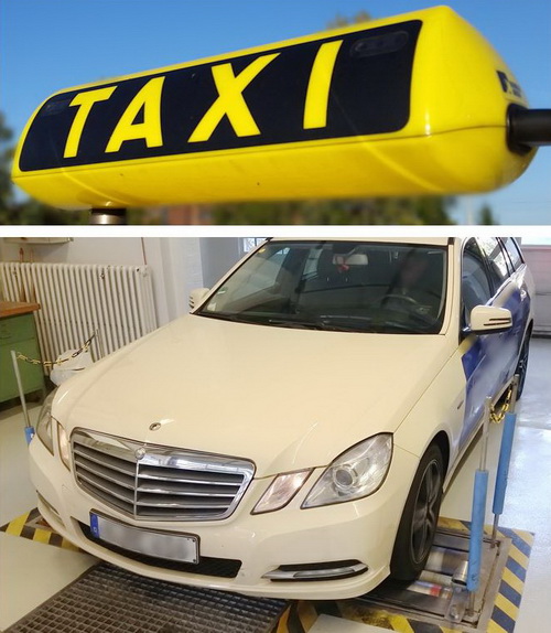 Messtechnische Prüfung eines Taxis auf einem Rollenprüfstand des MEN. Diese Prüfung ist auch bei einer Konformitätsbewertung erforderlich.