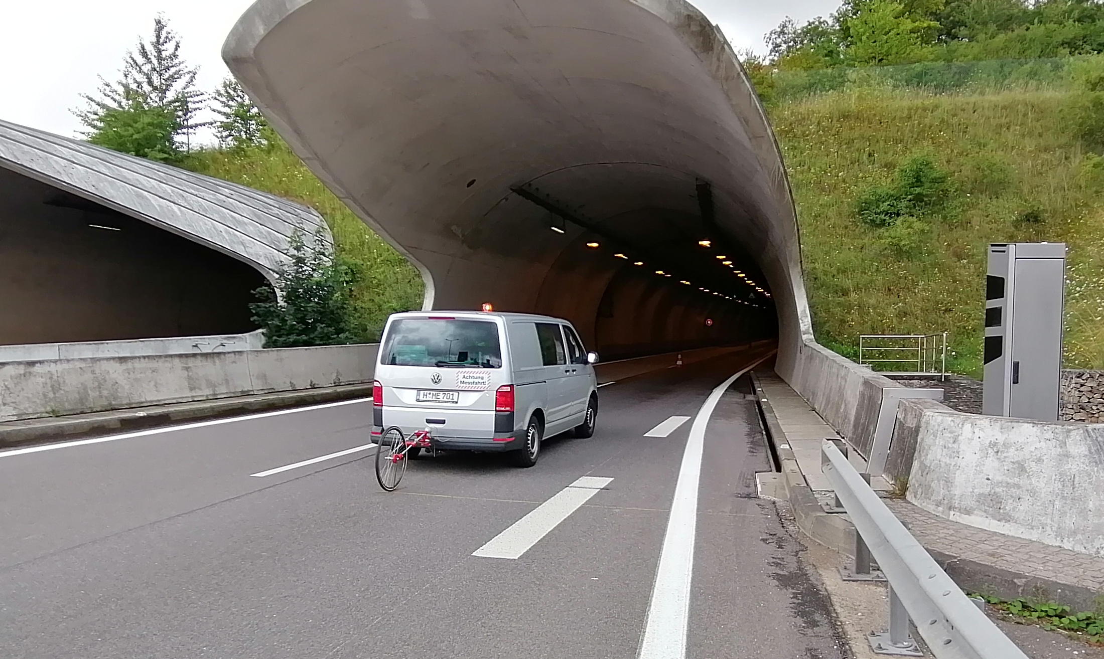 Für eine beidseitige Section Control-Geschwindigkeitsmessanlage an der luxemburgischen Autobahn A13 im Bereich des Markustunnels zwischen Schengen (L) und Bad Mondorf (D), wurde das Mess- und Eichwesen Niedersachsen (MEN) von der Luxemburger Zulassungsbehörde Société Nationale de Certification et d'Homologation (SNCH) beauftragt, die Wegstrecke der einzelnen Fahrbahnen der pro Fahrtrichtung zweispurigen Autobahn zu vermessen.